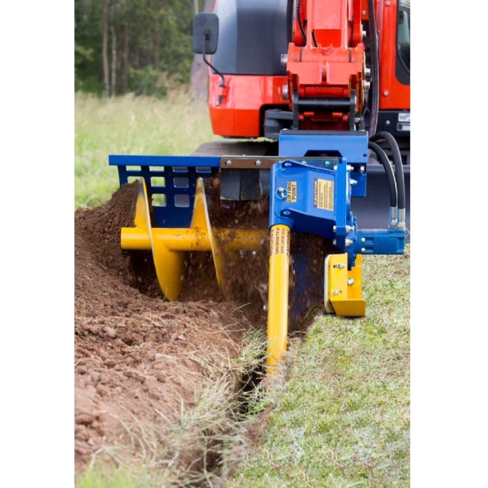 The laborious task of digging a trench has been transformed since the advent of the Trencher Attachment. Auger Torque’s range of trenchers are available for a wide range of skidsteers, mini loaders, backhoes and excavators up to 10 tonnes in weight and cover depths of up to 1.5 meters and widths up to 350mm, whilst spoil is piled neatly to the side of the trench by the integral auger. Using only the highest quality hydraulic motors that allow flow rates of up to 150LPM and Auger Torque’s planetary gearbox, means these trenchers have the reliability and power you need to ensure your trenching is carried out with ease.