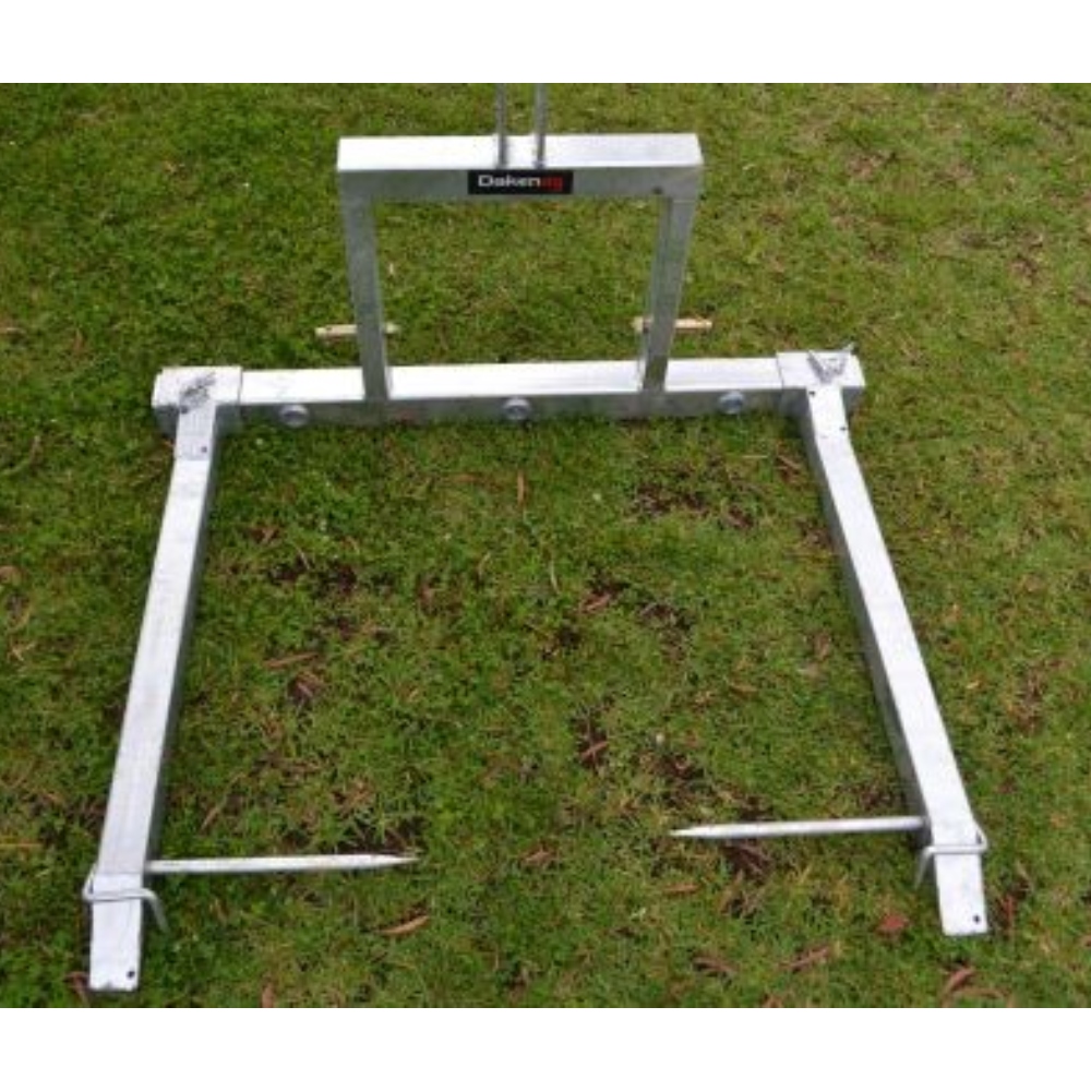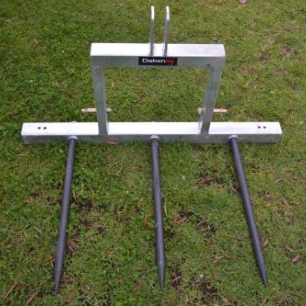 A development of Daken’s original “Udi Round bale fork”. This model will still carry and feed out round bales, but now has three “conus 2” receivers mounted and it’s supplied with three spikes. With this additon it will carry large square bales and will also pick up pallets.