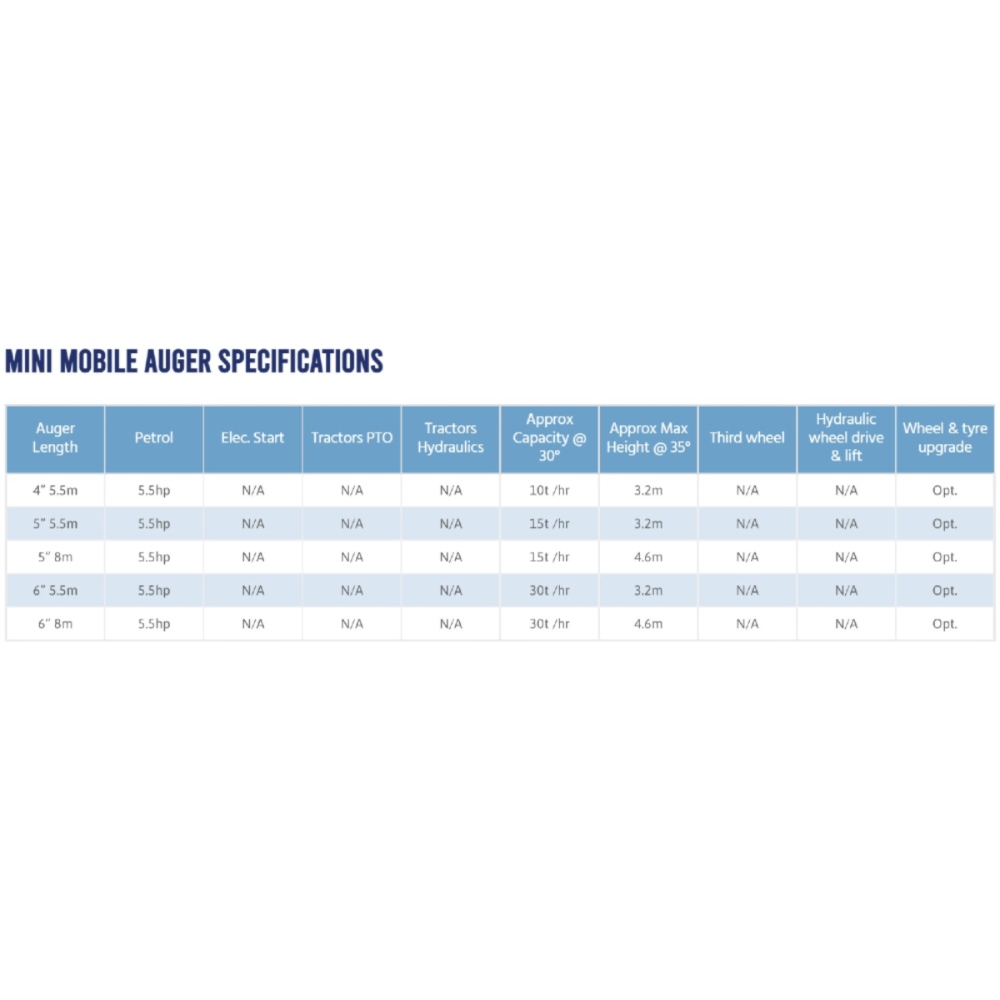 Grainline introduced the Mini Mobile auger to fulfill the requests for a small petrol drive pencil auger. Unlike electric drive augers, a petrol drive auger requires the engine to be mounted at a suitable angle and in a position at the lower end of the auger where an operator can safely start and control the engine from the ground.