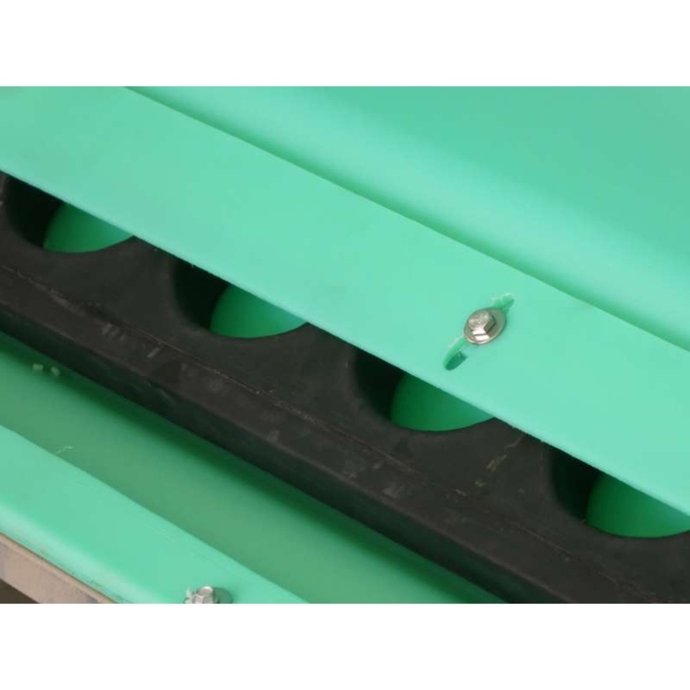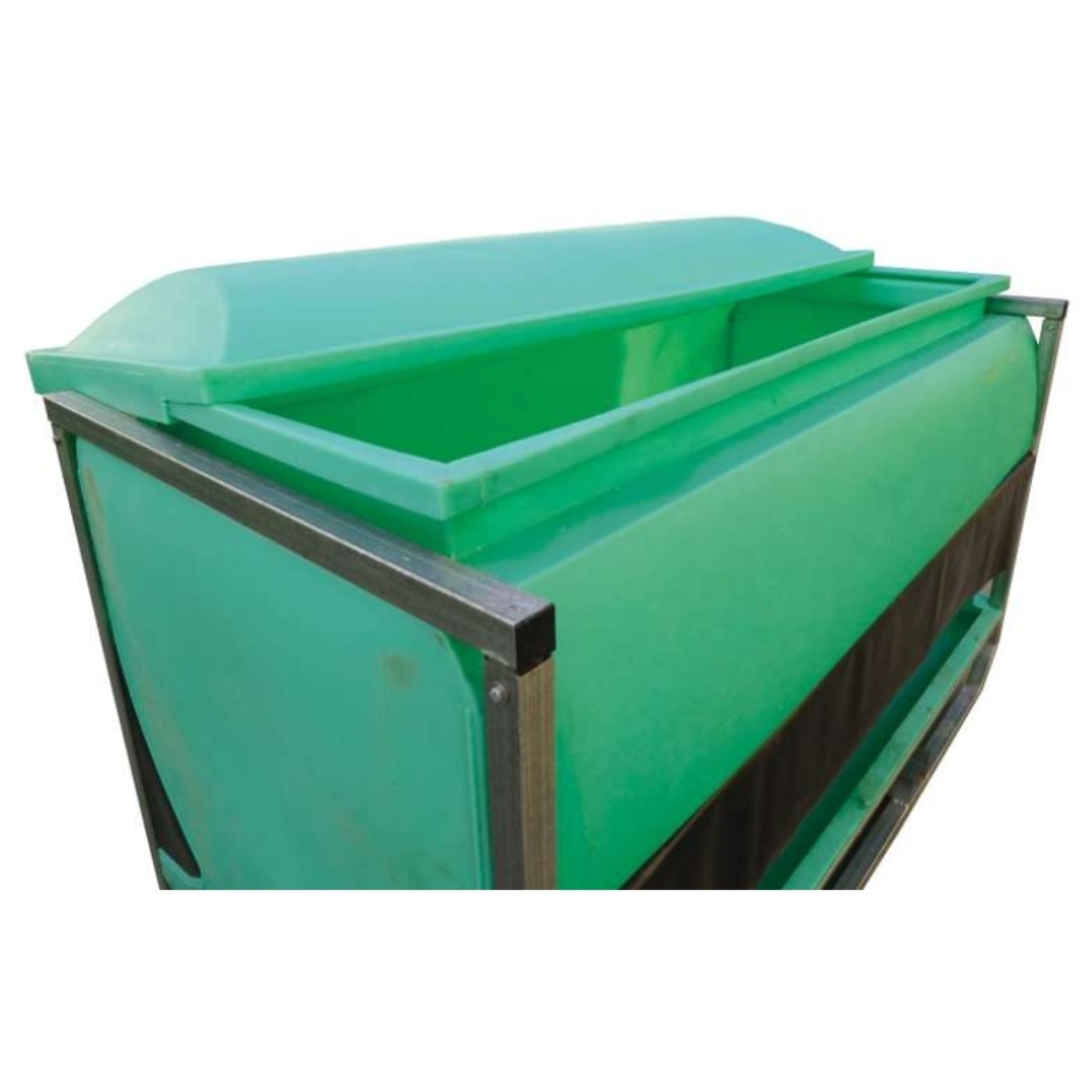 The 2400L Slick Feeder design incorporates a poly feeder body mounted in a sturdy galvanized steel frame. The easy action slide on lid provides an unparalleled level of weather resistance, and both the rate of feed discharge and the accessibility of feed are controlled by the galvanized steel feed adjustment plates. Extra protection from the elements is provided by the flexible rubber weather skirts that are fitted over each feed tray.