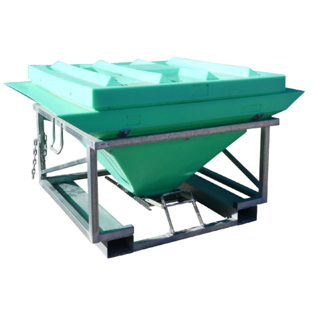 The 580 litre Centre JACKY® Bin design incorporates a poly hopper mounted on a forkliftable steel base.