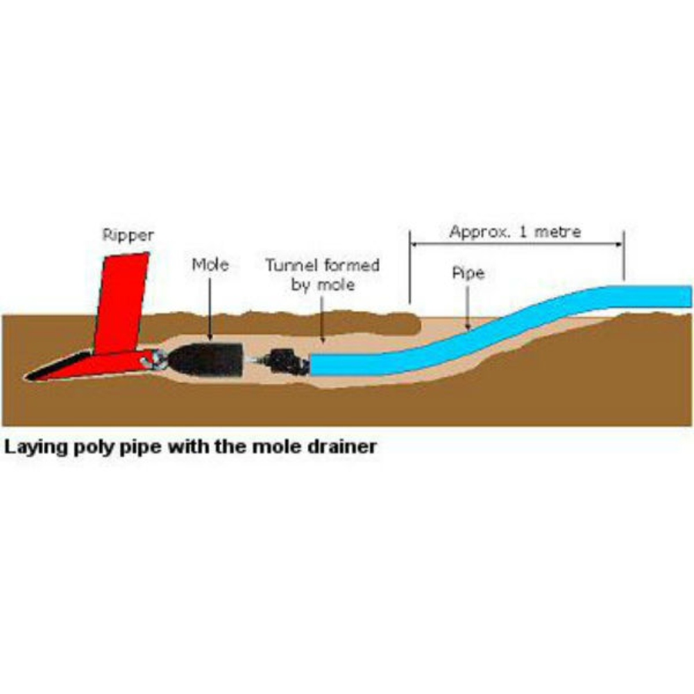 - Mole and Pipe Adaptor – Designed specifically to trail behind a single ripping tyne, the Mole creates a well-formed underground drain, ideal for draining wet areas. The pipe-laying attachment allows easy laying of poly pipe.