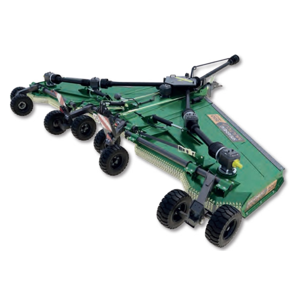 A heavy duty driveline with a 250hp input gearbox and high capacity rotor gearboxes ensures reliable power transfer, all protected by slip clutches for durability in demanding work. Hydragas suspension, built in shock absorbers and a walking axle improve stability and reduce ground pressure, while wide industrial tyres provide better flotation across uneven ground. Hydraulic wing lift and mechanical wing float allow the mower to follow contours, and folding wings reduce transport width to 2.8m for safer road travel.